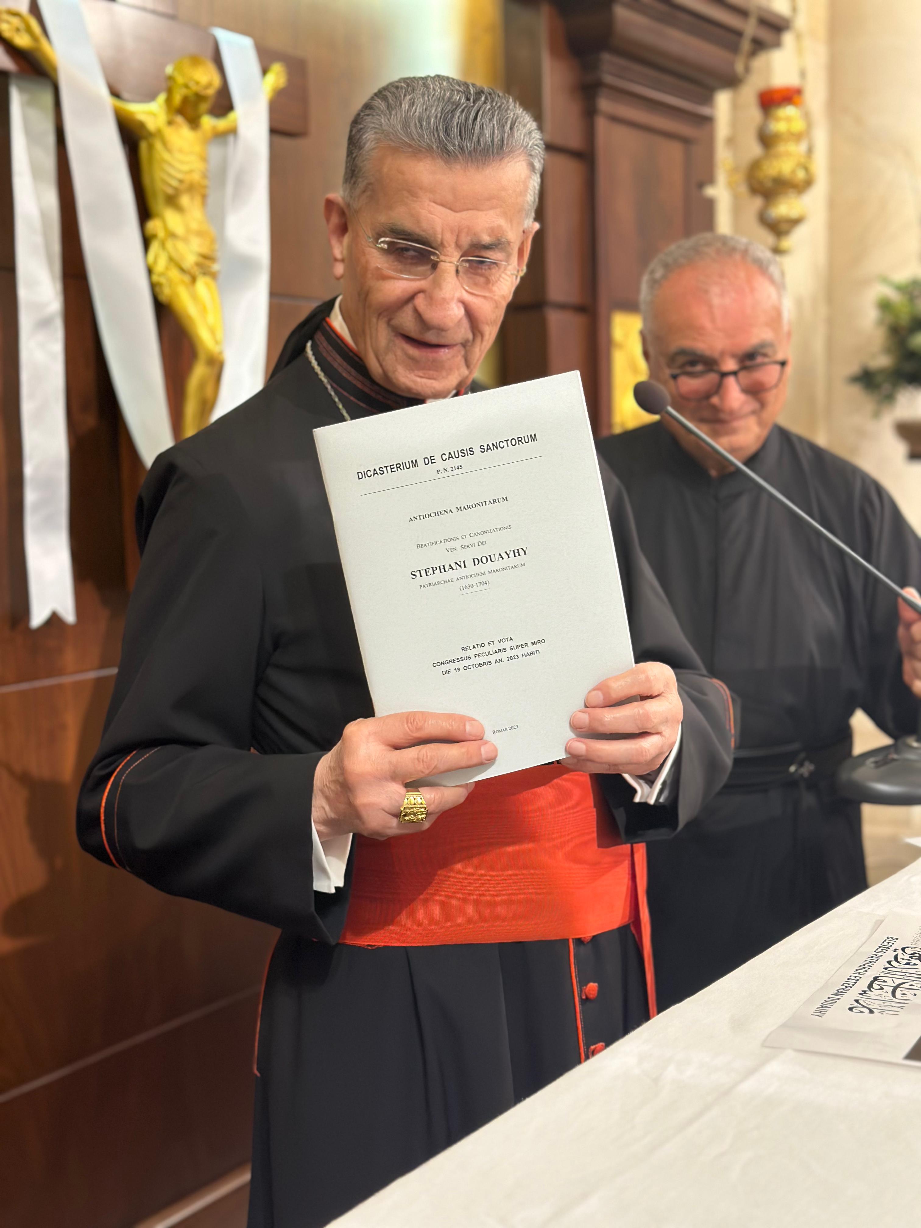 وفي الصرح البطريركي كانت صلاة قصيرة برئاسة البطريرك الراعي وكلمة مقتضبة عن الدويهي الطوباوي العتيد كما كانت كلمة للأب قزي حول مسار دعوى التطويب ثم وقع البطريرك الراعي الصورة الرسمية للبطريرك الدويهي التي سترفع في الكنائس وعلى المذابح.