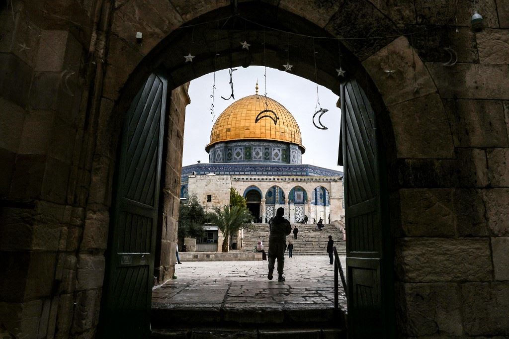 أشخاص يتوجهون نحو قبة الصخرة في مجمع المسجد الأقصى في البلدة القديمة بالقدس (3 ك2 2023، أ ف ب).