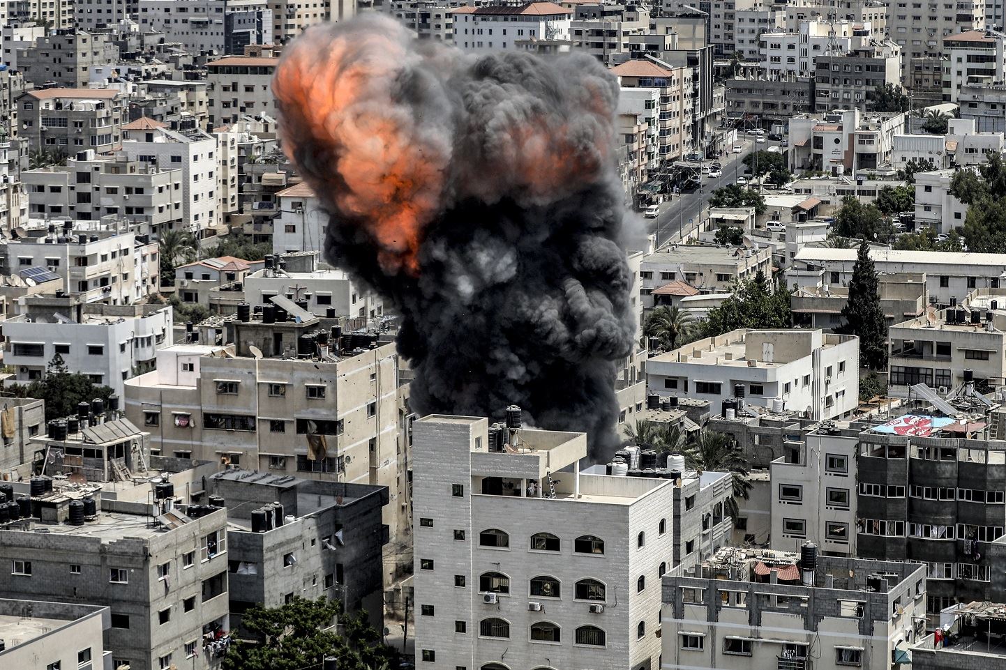 انفجار كرة نارية وتصاعد الدخان نتيجة غارة جوية إسرائيلية على مبنى في مدينة غزة (6 آب 2022 - أ ف ب).