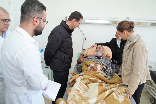 الرئيس السوري بشار الأسد وزوجته يتفقدان المصابين جرّاء الزلزال في مستشفى "تشرين" الجامعي.