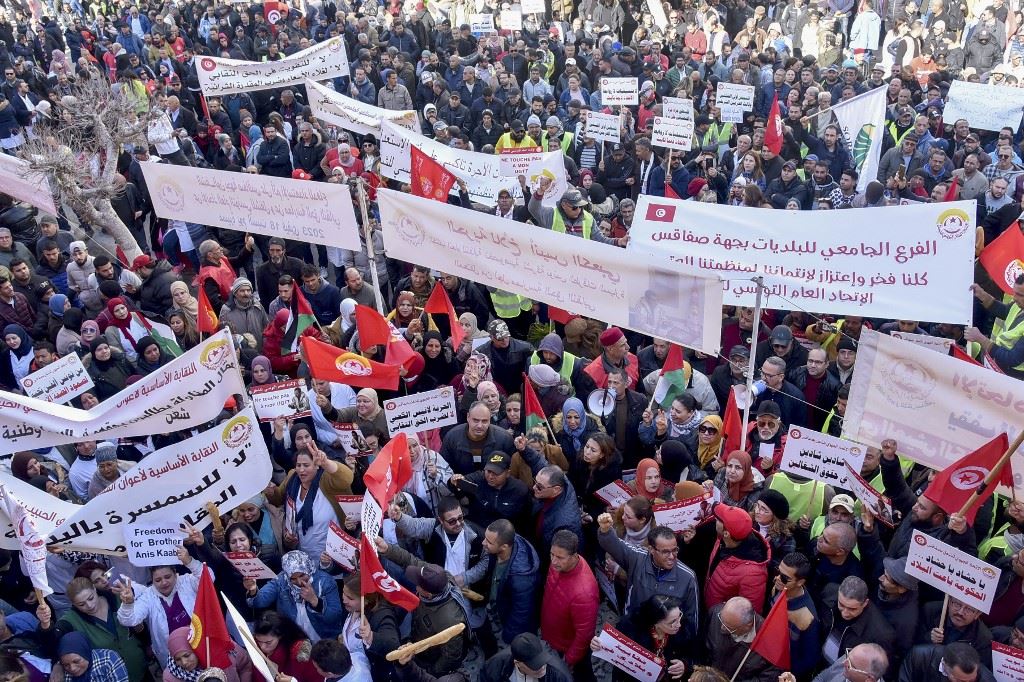 تظاهر السبت آلاف من انصار الاتحاد العام التونسي للشغل في محافظة صفاقس وسط شرق البلاد وفي مناطق أخرى، تنديداً بتردي الوضع الاقتصادي والاجتماعي وبـ"استهدافه" من قبل الرئيس قيس سعيّد.