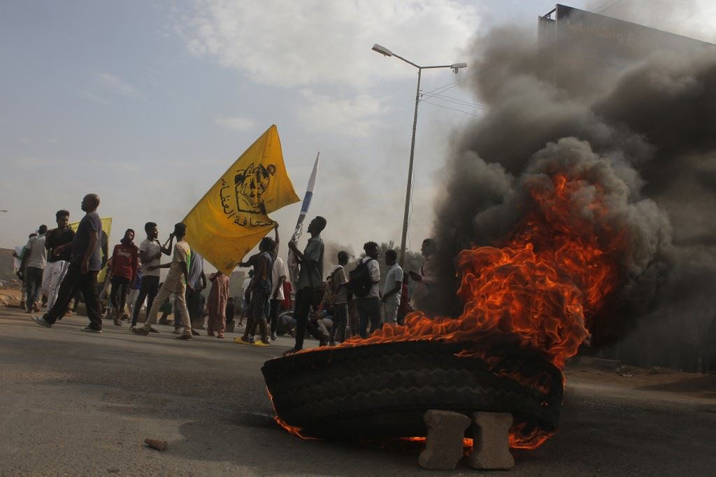 متظاهرون سودانيون أغلقوا أحد شوارع العاصمة الخرطوم (21 ت1 2022، أ ف ب).