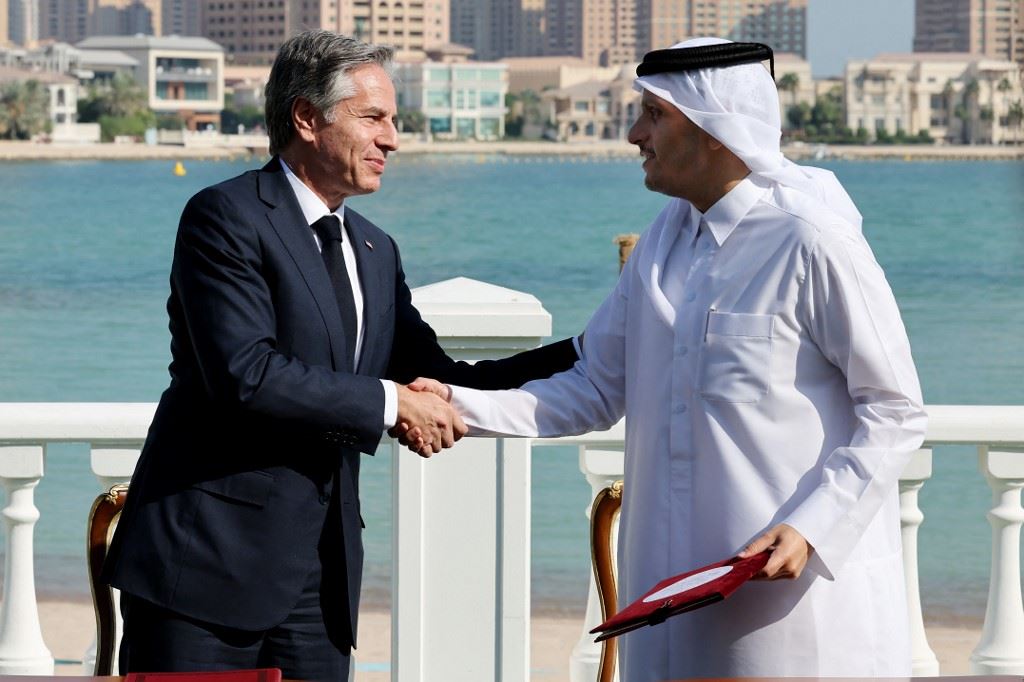 مصافحة بين بلينكن (إلى اليسار) ونظيره القطري محمد بن عبد الرحمن آل ثاني خلال احتفال توقيع وثيقة عقب اجتماعهما في الدوحة (22 ت2 2022، أ ف ب).
