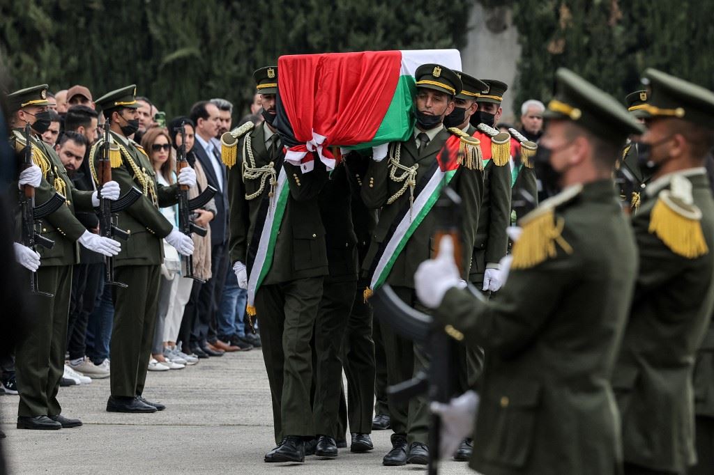 عناصر من حرس الشرف يحملون نعش قريع خلال تشييعه في مدينة رام الله بالضفة الغربية المحتلة (22 شباط 2023، أ ف ب).
