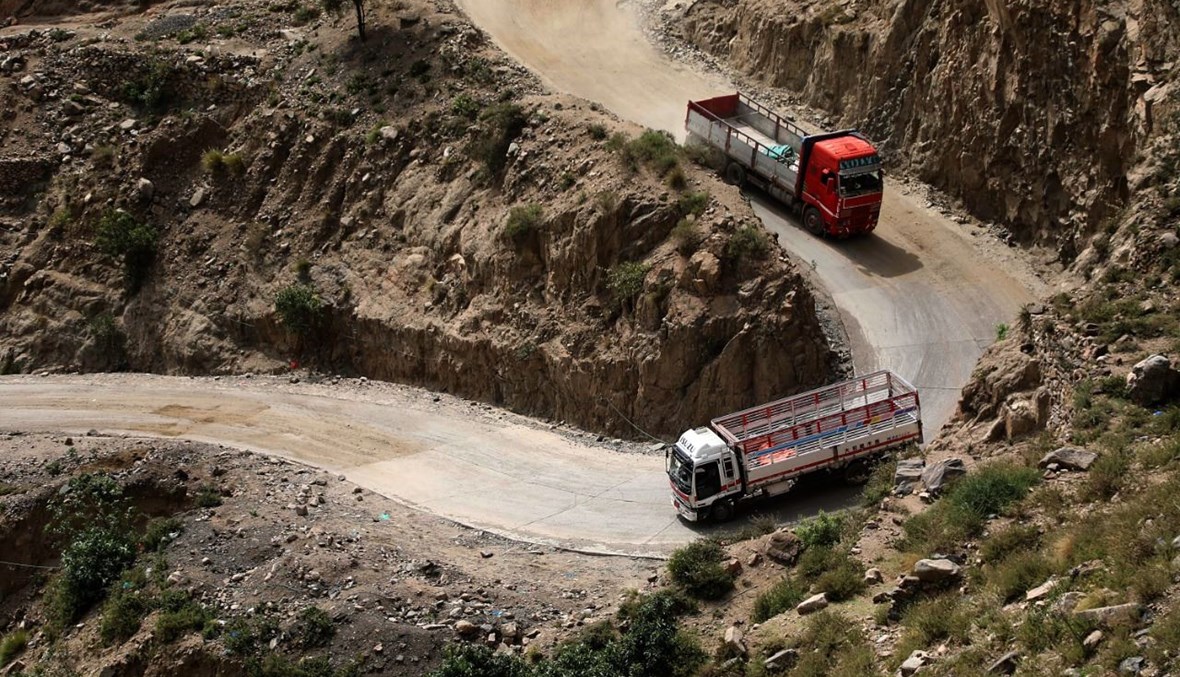 تسير شاحنات محملة بمواد مختلفة بحذر وبطء شديدين على طريق عند منحدر جبلي مع منعطفات ضيقة، في مغامرة خطرة، لكنها ضرورية لإبقاء مدينة تعز جنوب غرب اليمن على قيد الحياة.
