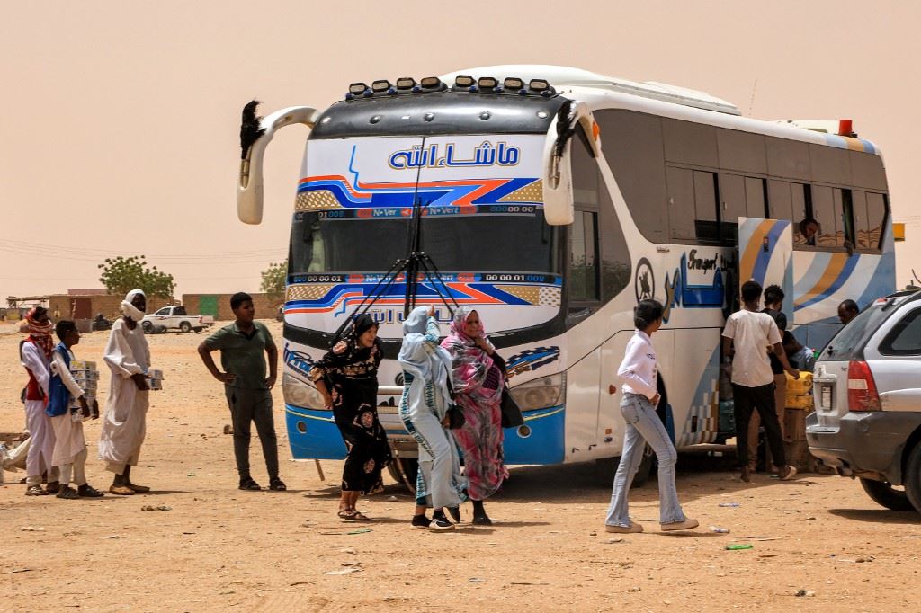 أشخاص ينزلون من حافلة ركاب في استراحة ملتاغا قرب غانيتي في الولاية الشمالية بالسودان (25 نيسان 2023، أ ف ب).