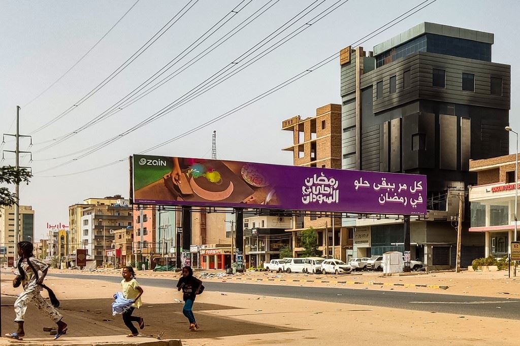 أطفال يركضون قرب المقر المحترق للمكتب المركزي للإحصاء السوداني على طريق الستين جنوب الخرطوم (30 أيار 2023ـ أ ف ب).