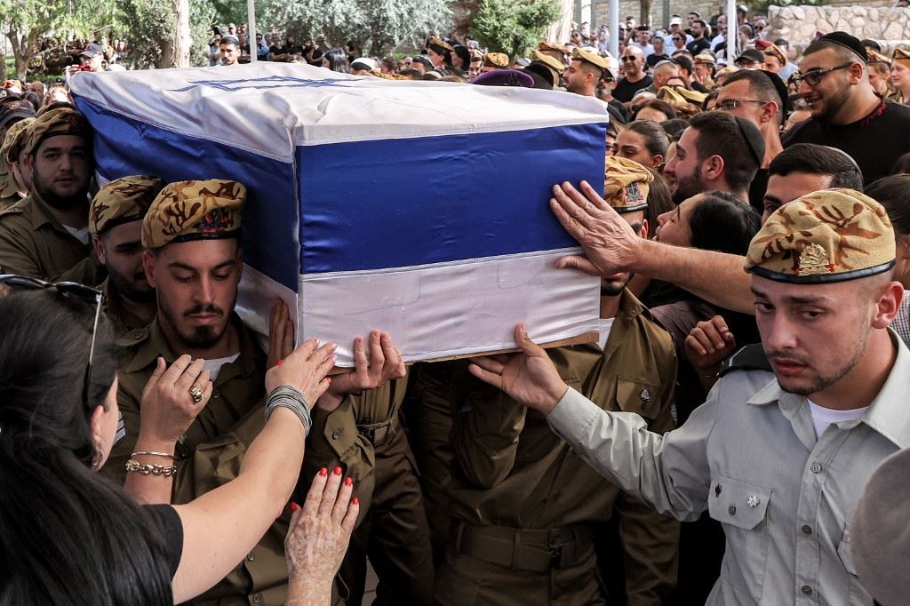 جنود إسرائيليون يحملون نعش الجندي القتيل أوهاد دهان خلال جنازة في المقبرة العسكرية في مدينة أوفاكيم جنوب إسرائيل (4 حزيران 2023، ا ف ب).
