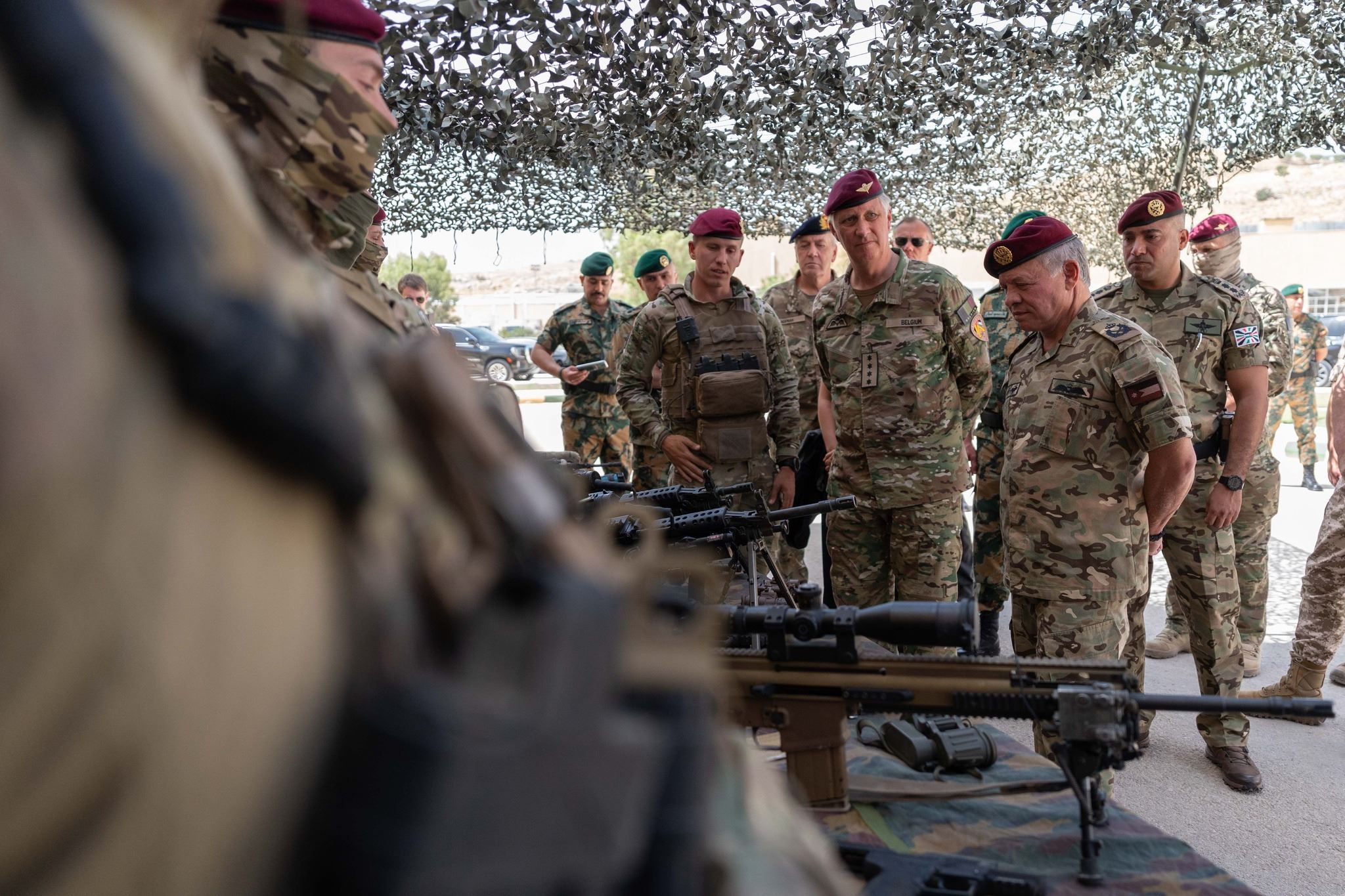الملك عبدالله الثاني وملك بلجيكا فيليب يجولان في معرض للأسلحة البلجيكية ضم أجهزة ومعدات وذخيرة حديثة استخدمت في التمرين (14 حزيران 2023، الديوان الملكي الهاشمي).