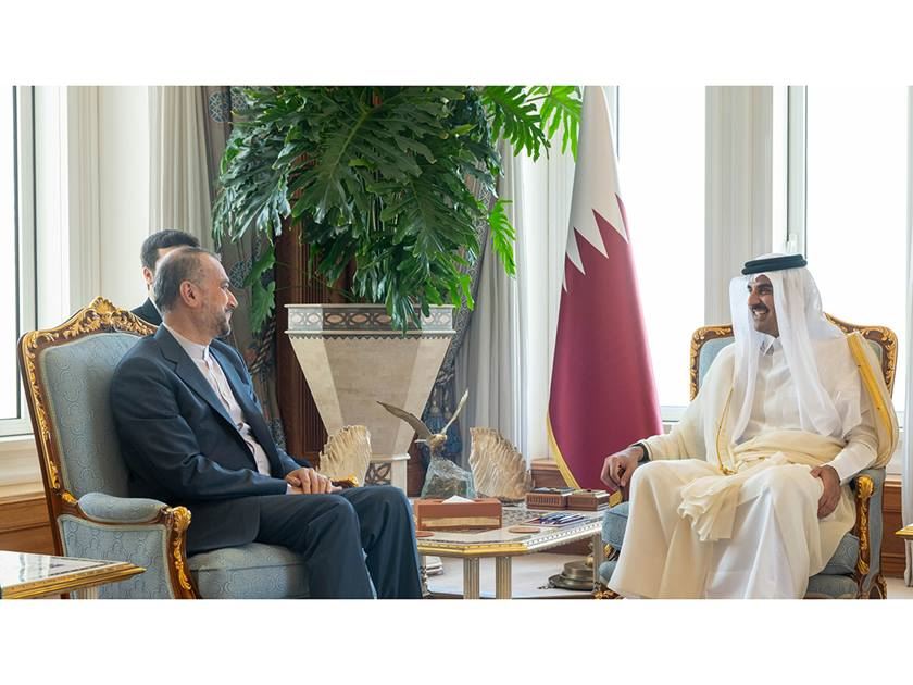 أمير قطر الشيخ تميم بن حمد آل ثاني ووزير الخارجية الإيراني حسين أمير عبد اللهيان في الدوحة أمس (قنا).