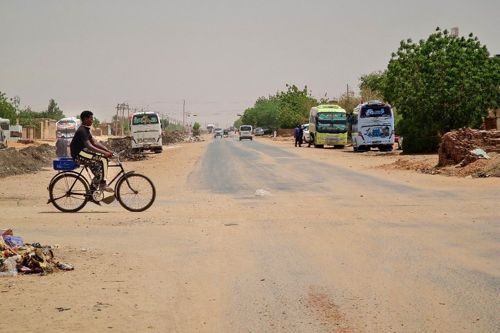 صبي يعبر بدراجته طريقا مقفرا في جنوب الخرطوم (21 حزيران 2023، أ ف ب).