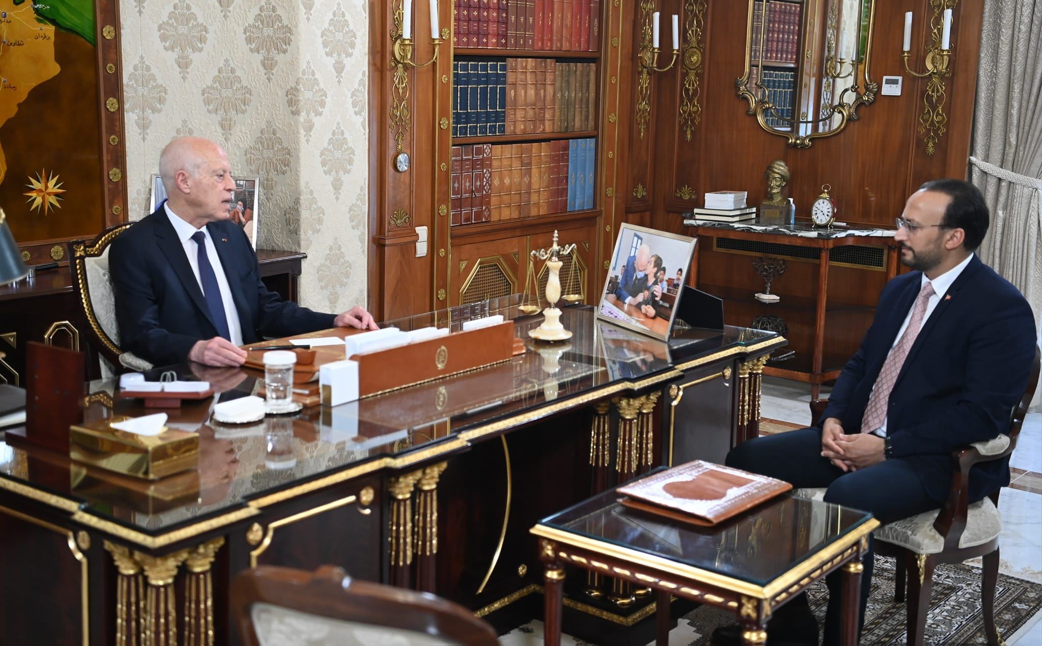 الرئيس سعيد مجتمعا بوزير تكنولوجيات الاتصال نزار بن ناجي في قصر قرطاج (11 تموز 2023، رئاسة الجمهورية التونسية).