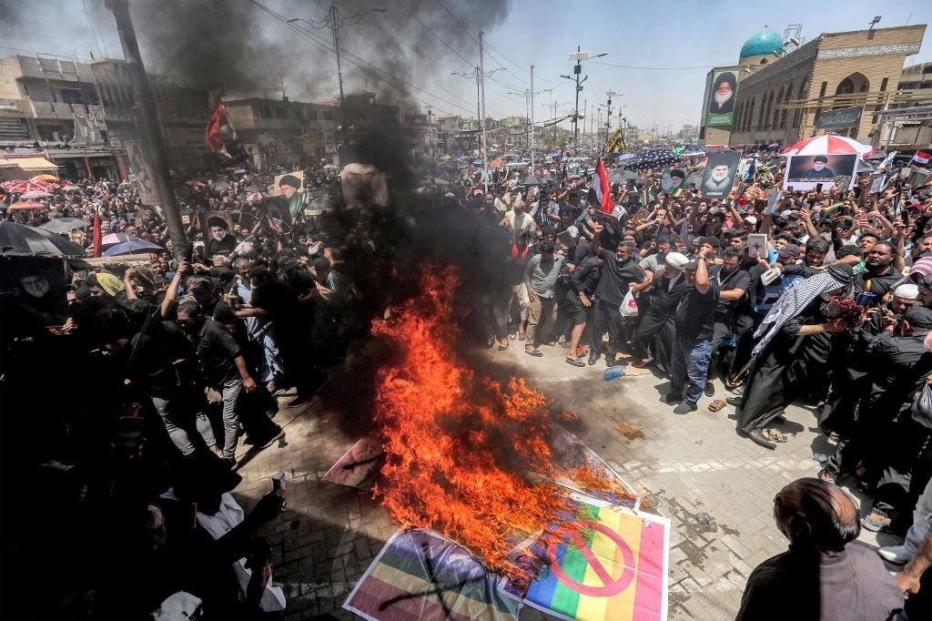 وحرق محتجون علم المثليين، وهو فعل يرى فيه مقتدى الصدر تحدياً واضحاً للغرب وتنديداً بـ"ازدواجية المعايير" المتعلقة بحرية التعبير.