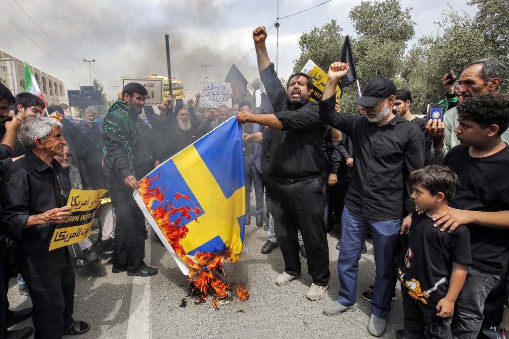 وفي طهران، لوح مئات المتظاهرين بالأعلام الإيرانية وبنسخ من المصحف وهم يهتفون "تسقط الولايات المتحدة والمملكة المتحدة وإسرائيل والسويد"، فيما أشعل بعضهم النار في العلم السويدي الأزرق والأصفر.