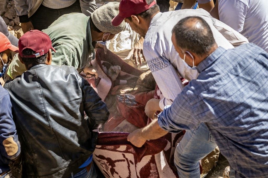 متطوعون ينتشلون جثة من تحت أنقاض منازل منهارة في تفغاغت جنوب غرب مراكش (10 ايلول 2023، أ ف ب).