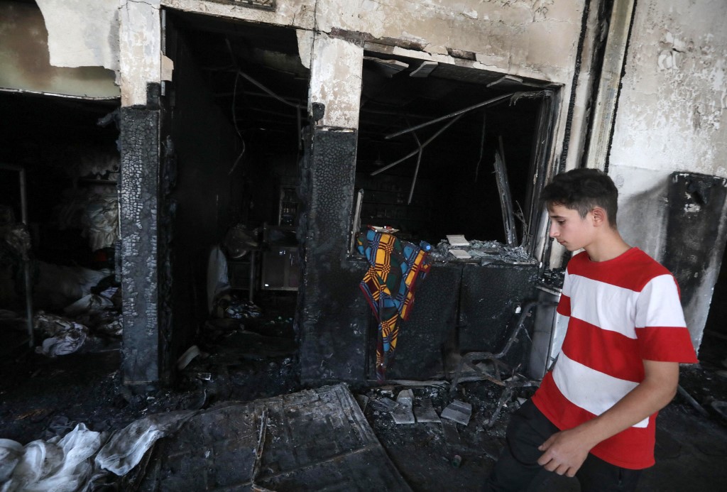 رجل إطفاء يتفقد الأضرار في قاعة مناسبات في قرقوش بعد اندلاع حريق خلال حفلة زفاف (27 ايلول 2023، أ ف ب).
