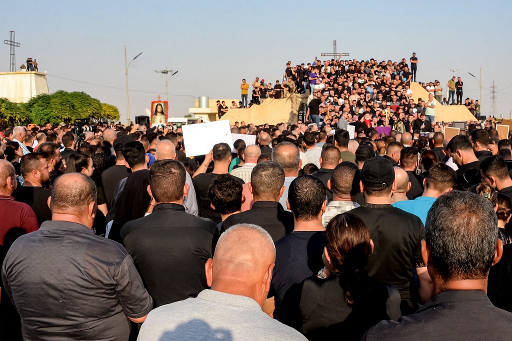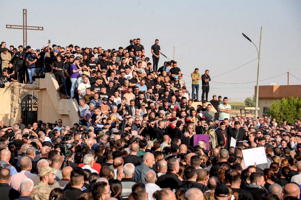 في المقبرة في قرقوش، البلدة المسيحية الواقعة في سهل نينوى شرق مدينة الموصل، تجمّع المئات من المشيّعين حول رؤساء الكنائس العراقية الذين رددوا ترانيم باللغتين السريانية والعربية.