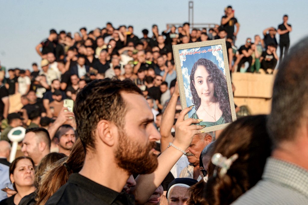 دموع خلال جنازة ضحايا حريق قاعة الزفاف في قرقوش الشمالية (27 ايلول 2023، ا ف ب).