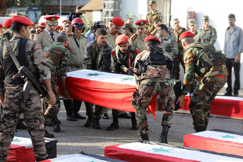عناصر من الجيش السوري يحملون نعوش رفاقهم الضحايا في هجوم الكلية الحربية في حمص (أ ف ب).