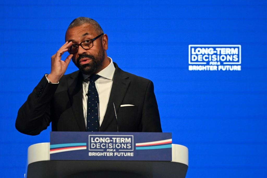 كليفرلي ملقيا خطابا خلال اليوم الافتتاحي للمؤتمر السنوي لحزب المحافظين في مانشستر شمال إنكلترا (1 ت1 2023، أ ف ب).