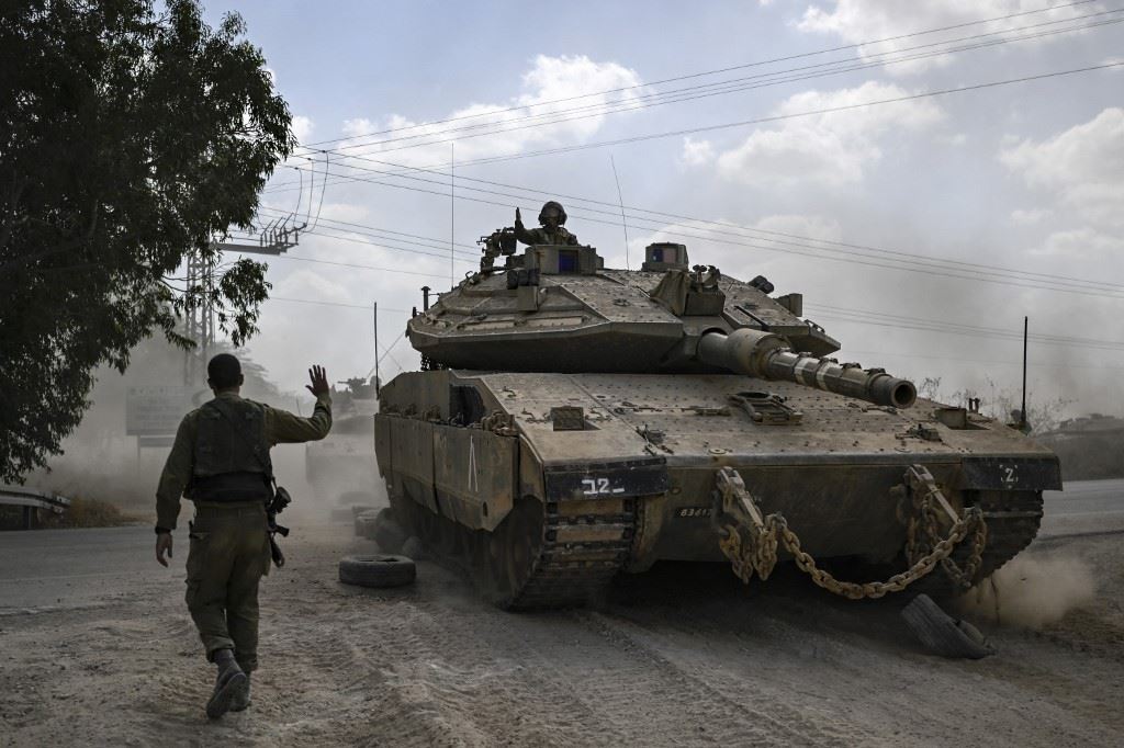 جندي إسرائيلي يوجه دبابة ميركافا خلال انتشارها مع دبابات أخرى على طول الحدود مع قطاع غزة في جنوب إسرائيل (13 ت1 2023، أ ف ب).