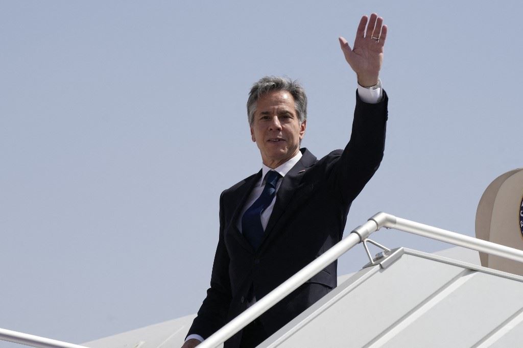 بلينكن ملوحا قبل مغادرته الرياض (15 ت1 2023، أ ف ب).