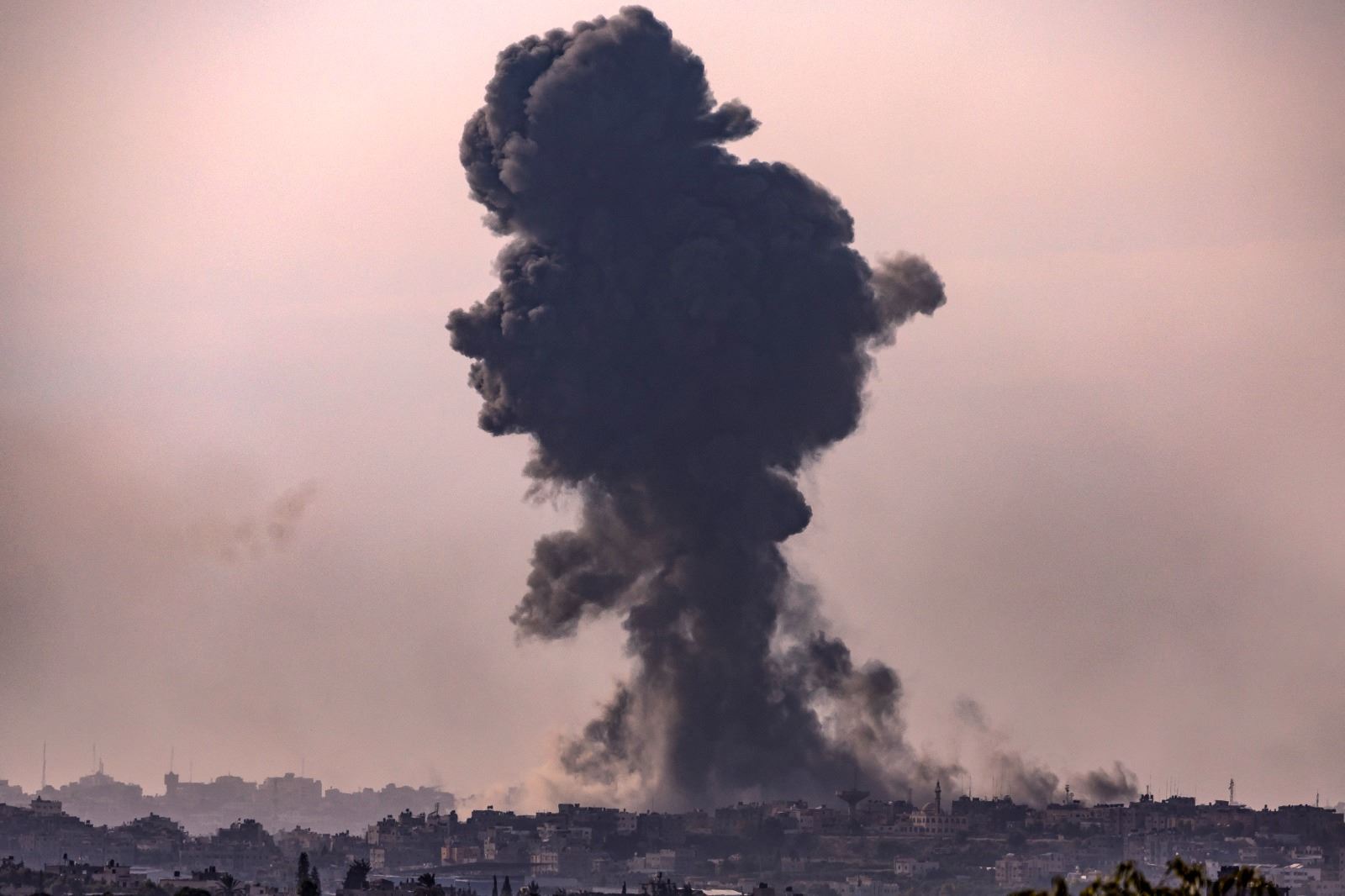 صورة ملتقطة من سديروت جنوب إسرائيل، تظهر دخانا يتصاعد خلال قصف إسرائيلي على قطاع غزة (31 ت1 2023، أ ف ب).