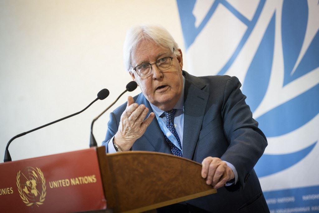 غريفيث متكلما خلال مؤتمر صحافي في مبنى الأمم المتحدة في جنيف (15 ت2 2023، أ ف ب).