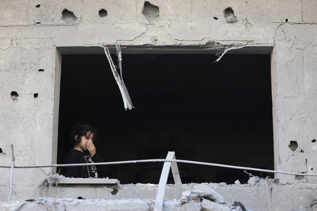 فتاة فلسطينية تنظر من نافذة مبنى متضرر في مخيم النصيرات للاجئين وسط قطاع غزة (17 ت2 2023، أ ف ب).