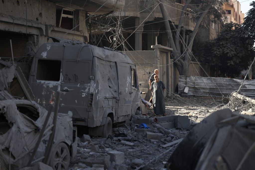 أشخاص يتفقدون الأضرار في مخيم النصيرات للاجئين في وسط قطاع غزة (17 ت2 2023، أ ف ب).