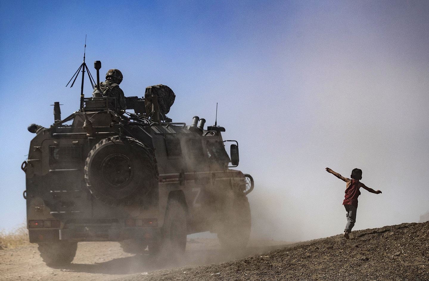دورية روسية تركية مشتركة في الريف الشرقي لبلدة الدرباسية بالقرب من الحدود مع تركيا في محافظة الحسكة شمال شرق سوريا (28 تموز 2022 - أ ف ب).