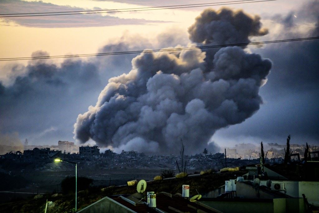صورة ملتقطة من الجانب الإسرائيلي للحدود مع قطاع غزة، تظهر الدخان يتصاعد فوق ابنية خلال غارات إسرائيلية على الجزء الشمالي من القطاع الفلسطيني (22 ت2 2023، أ ف ب).