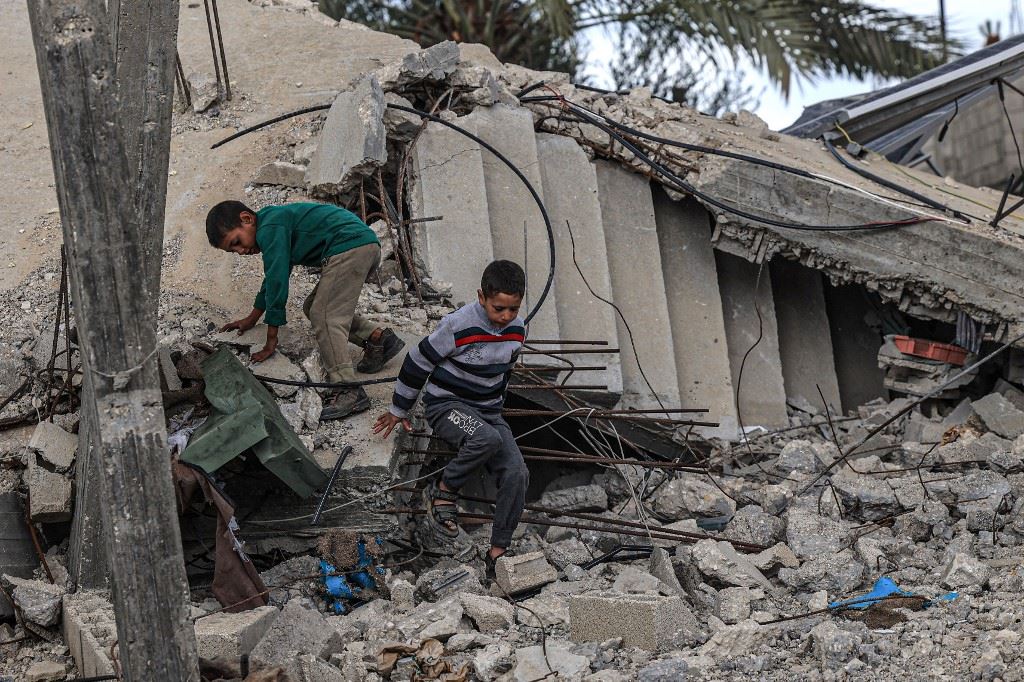 أطفال فلسطينيون يسيرون وسط الدمار الذي خلفته الغارات الإسرائيلية في قرية خزاعة شرق خان يونس بالقرب من السياج الحدودي بين إسرائيل وجنوب قطاع غزة (27 ت2 2023، أ ف ب).