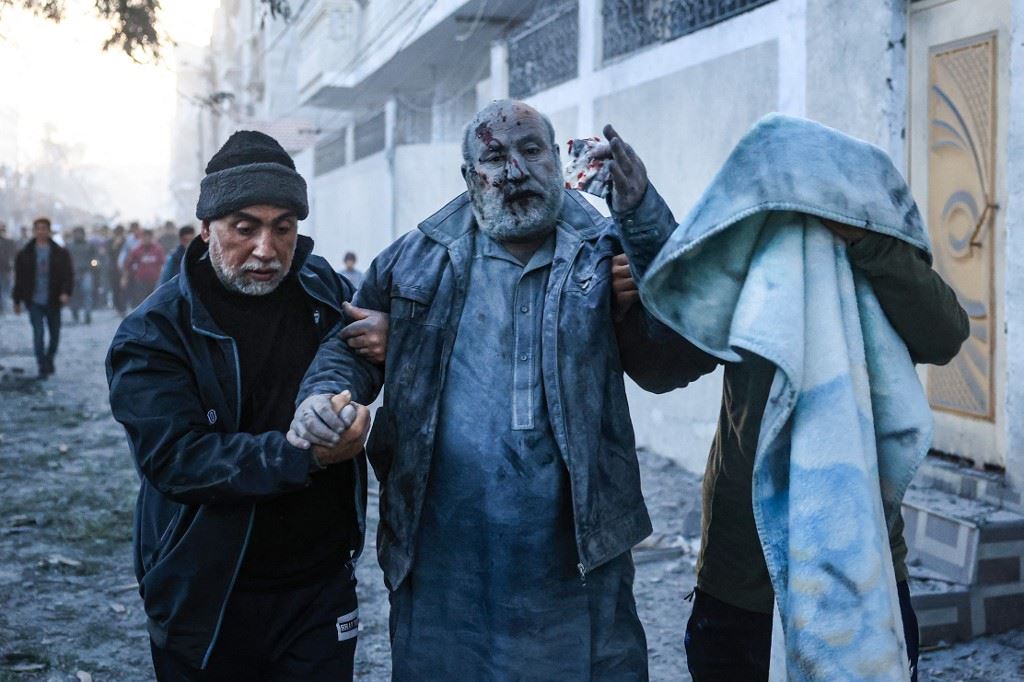 فلسطينيون يساعدون رجلا أصيب في غارة إسرائيلية في رفح بجنوب قطاع غزة (3 ك2 2023، أ ف ب).