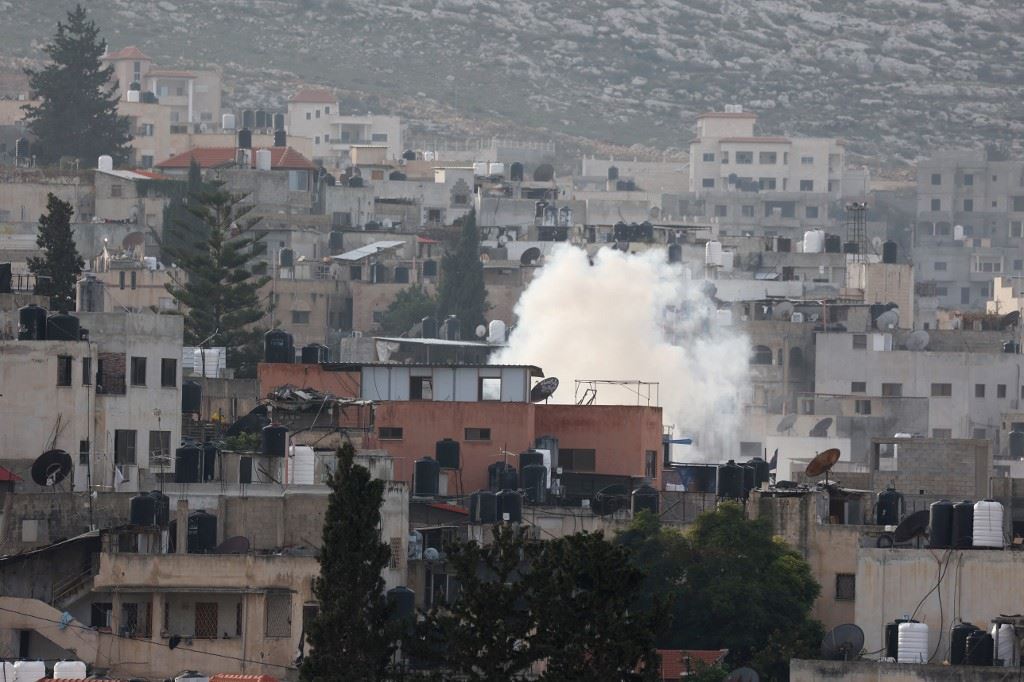 دخان يتصاعد في مخيم جنين للاجئين بالضفة الغربية المحتلة خلال عملية اقتحام للجيش الإسرائيلي (12 ك1 2023، أ ف ب).