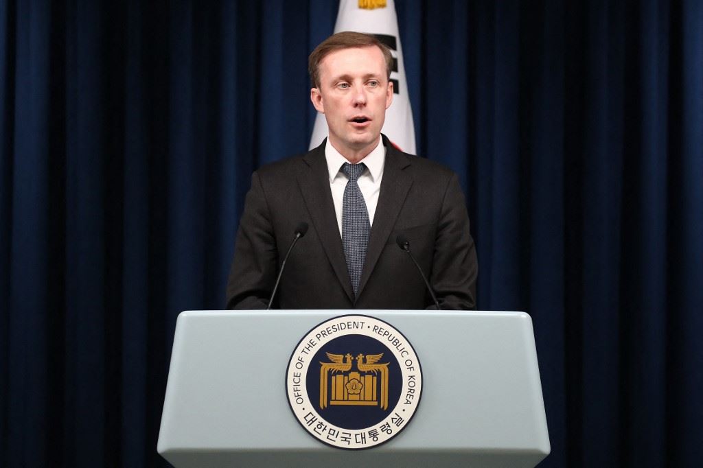 سوليفان خلال مؤتمر صحافي مشترك مع مستشار الأمن القومي الكوري الجنوبي تشو تاي يونغ والأمين العام للأمن القومي الياباني تاكيو أكيبا في سيول (9 ك1 2023، أ ف ب).