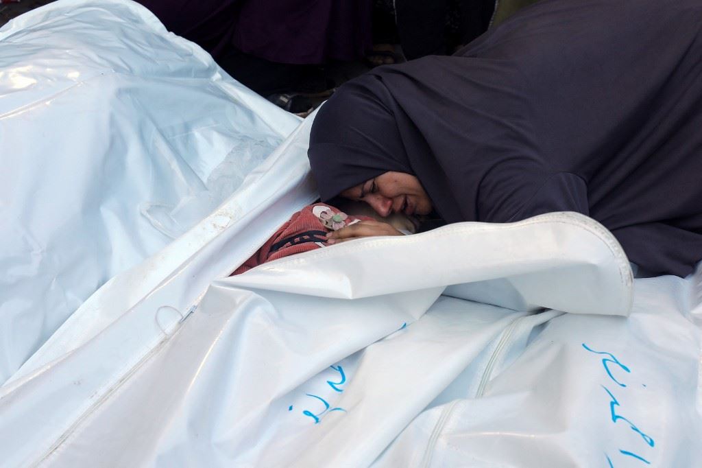 والدة ترتمي على جسد ولدها بعدما قتلته إسرائيلي بالغارات المتواتصلة على القطاع (أ ف ب).
