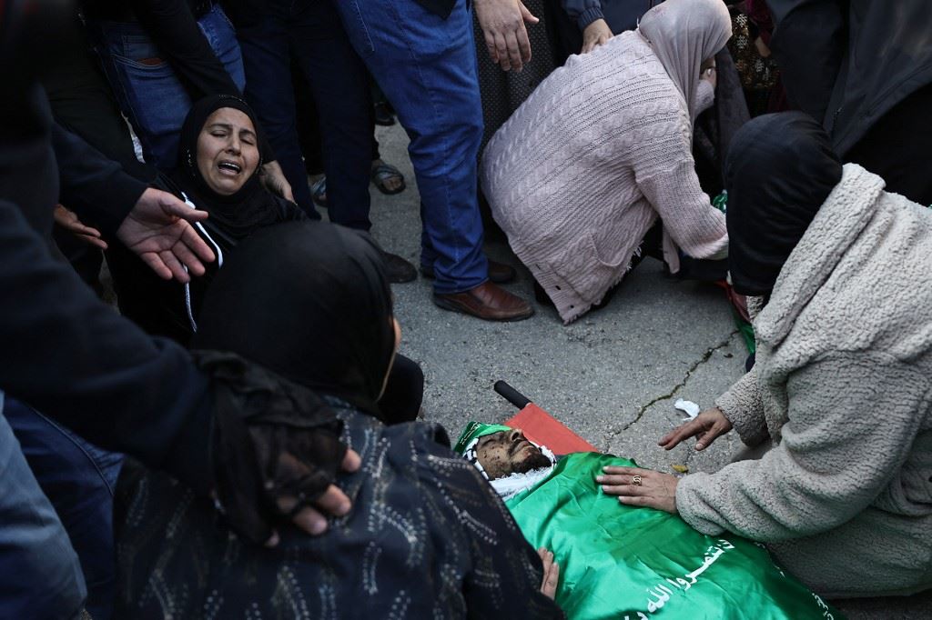 أقارب يبكون قرب جثة ملفوفة بالعلم لأحد الفلسطينيين الستة الذين قُتلوا خلال غارة إسرائيلية في جنين بالضفة الغربية المحتلة، خلال تشييعه (7 ك2 2024، أ ف ب).