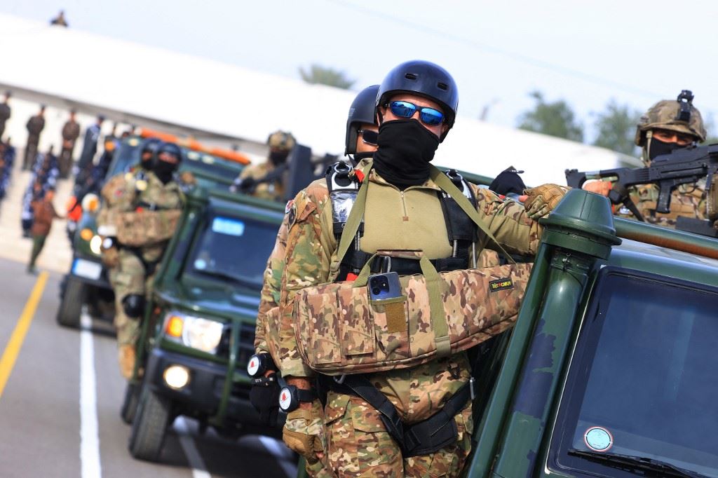 عناصر من الشرطة العراقية يشاركون في عرض عسكري في بغداد بمناسبة عيد الشرطة (9 ك2 2024، أ ف ب).
