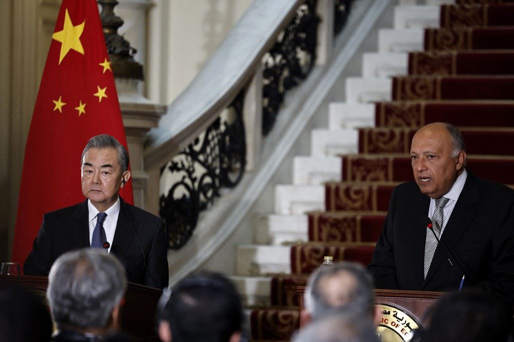 وزيرا الخارجية المصري سامح شكري (إلى اليمين) والصيني وانغ يي خلال مؤتمر صحافي عقب اجتماعهما في قصر التحرير في القاهرة (14 ك2 2024، أ ف ب).