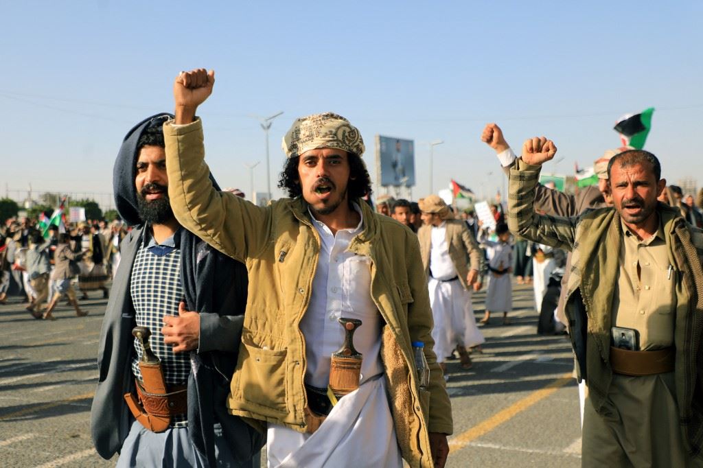 متظاهرون يمنيون خلال احتجاج في صنعاء بعد ضربات أميركية وبريطانية (12 ك2 2024، أ ف ب).