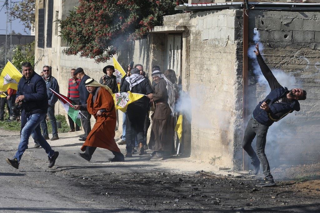 متظاهرون فلسطينيون يواجهون القوات الإسرائيلية بعد احتجاج على مصادرة إسرائيل للأراضي الفلسطينية في قرية كفر قدوم بالضفة الغربية المحتلة (30 ك1 2022، أ ف ب).
