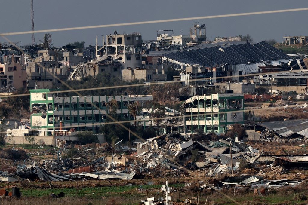 صورة ملتقطة من جنوب إسرائيل، تظهر أبنية مدمرة في قطاع غزة (17 ك2 2024، أ ف ب).