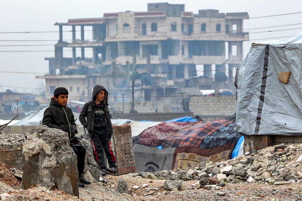 أطفال يقفون بجانب خيام نصبت بالقرب من مبنى تضرر من جراء زلزال 6 شباط 2023، في بلدة جنديرس شمال غرب محافظة حلب السورية (3 شباط 2024، أ ف ب).