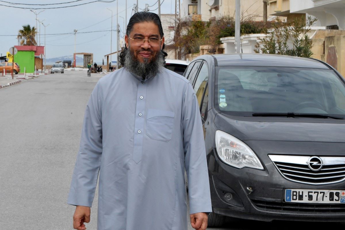 الإمام التونسي محجوب محجوبي يقف في شارع بالقرب من منزله في بلدة سليمان، بعد يوم من طرده من فرنسا (23 شباط 2024، أ ف ب).