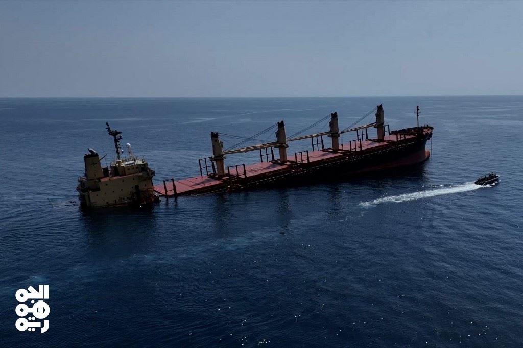 صورة نشرتها قناة الجمهورية اليمنية في 26 شباط 2024، وتظهر سفينة الشحن روبيمار وهي تغرق قبالة سواحل اليمن (أ ف ب).