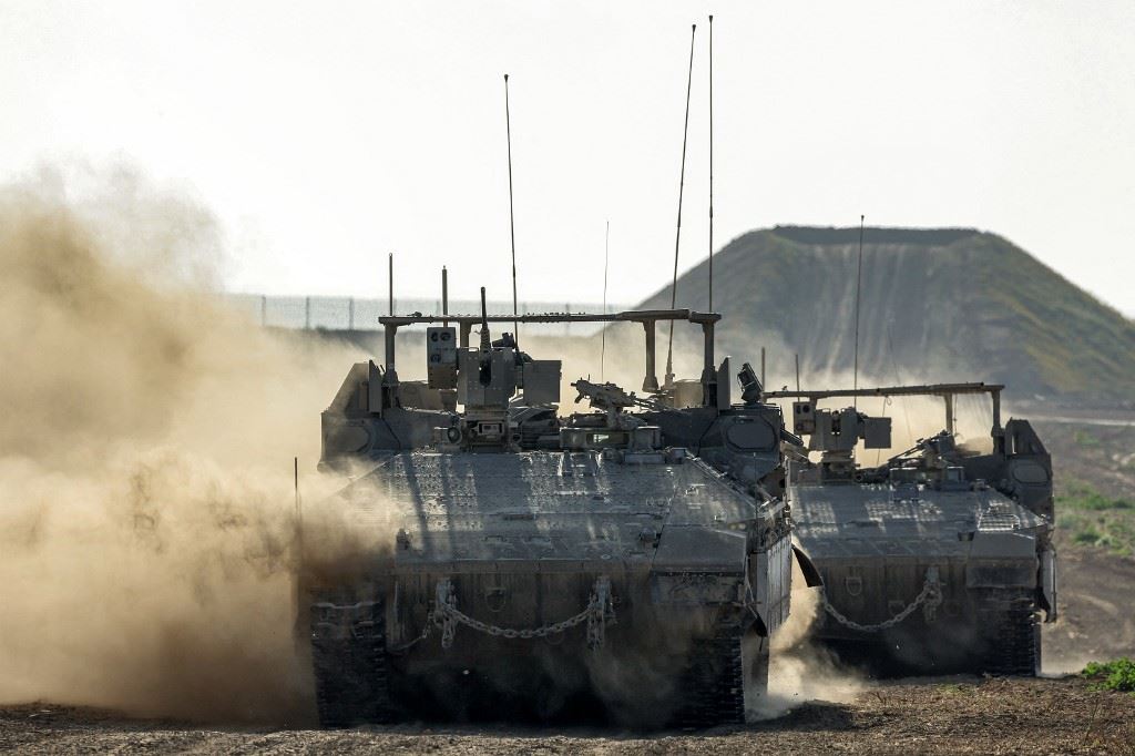 صورة ملتقطة من الحدود الجنوبية لإسرائيل مع قطاع غزة، تظهر مركبة قتالية إسرائيلية تتحرك في موقع بالقرب من الأراضي الفلسطينية (13 آذار 2024، أ ف ب).