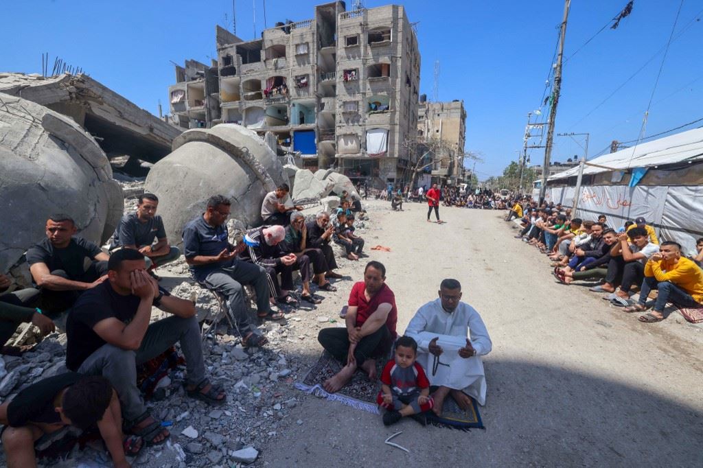 فلسطينيون يؤدون صلاة ظهر الجمعة بجوار أنقاض مسجد الفاروق المدمر في رفح جنوب قطاع غزة (19 نيسان 2024، أ ف ب).
