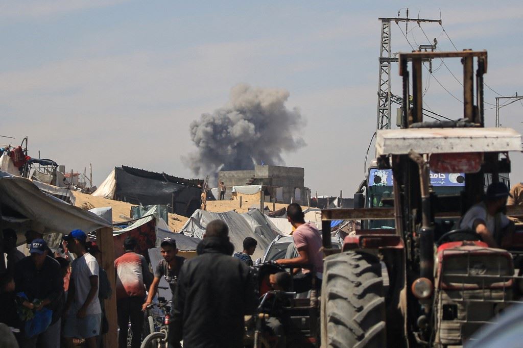 دخان يتصاعد بعد قصف إسرائيلي بينما يمر فلسطينيون نازحون في رفح جنوب قطاع غزة (31 ايار 2024، أ ف ب).