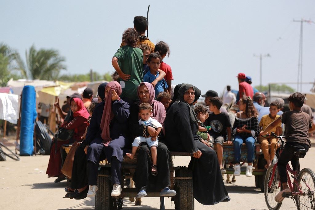 فلسطينيون يركبون عربة في منطقة تؤوي النازحين في رفح جنوب قطاع غزة (19 حزيران 2024، أ ف ب).